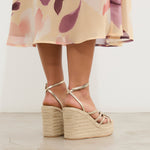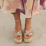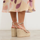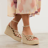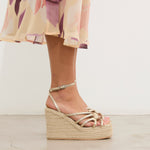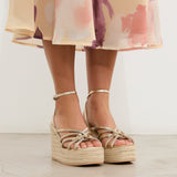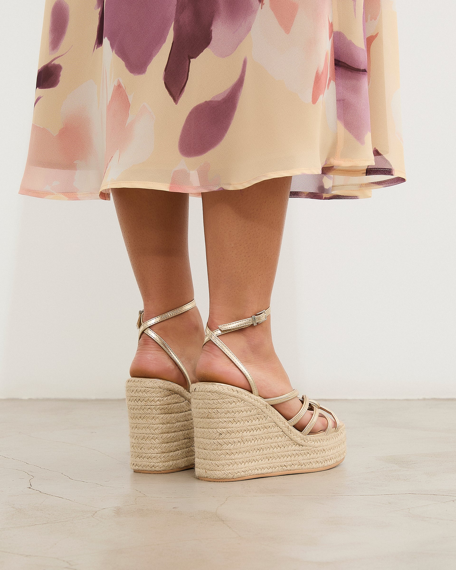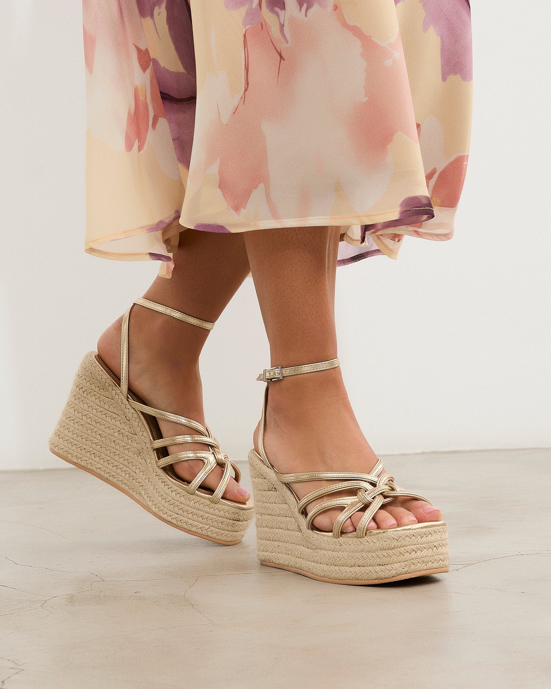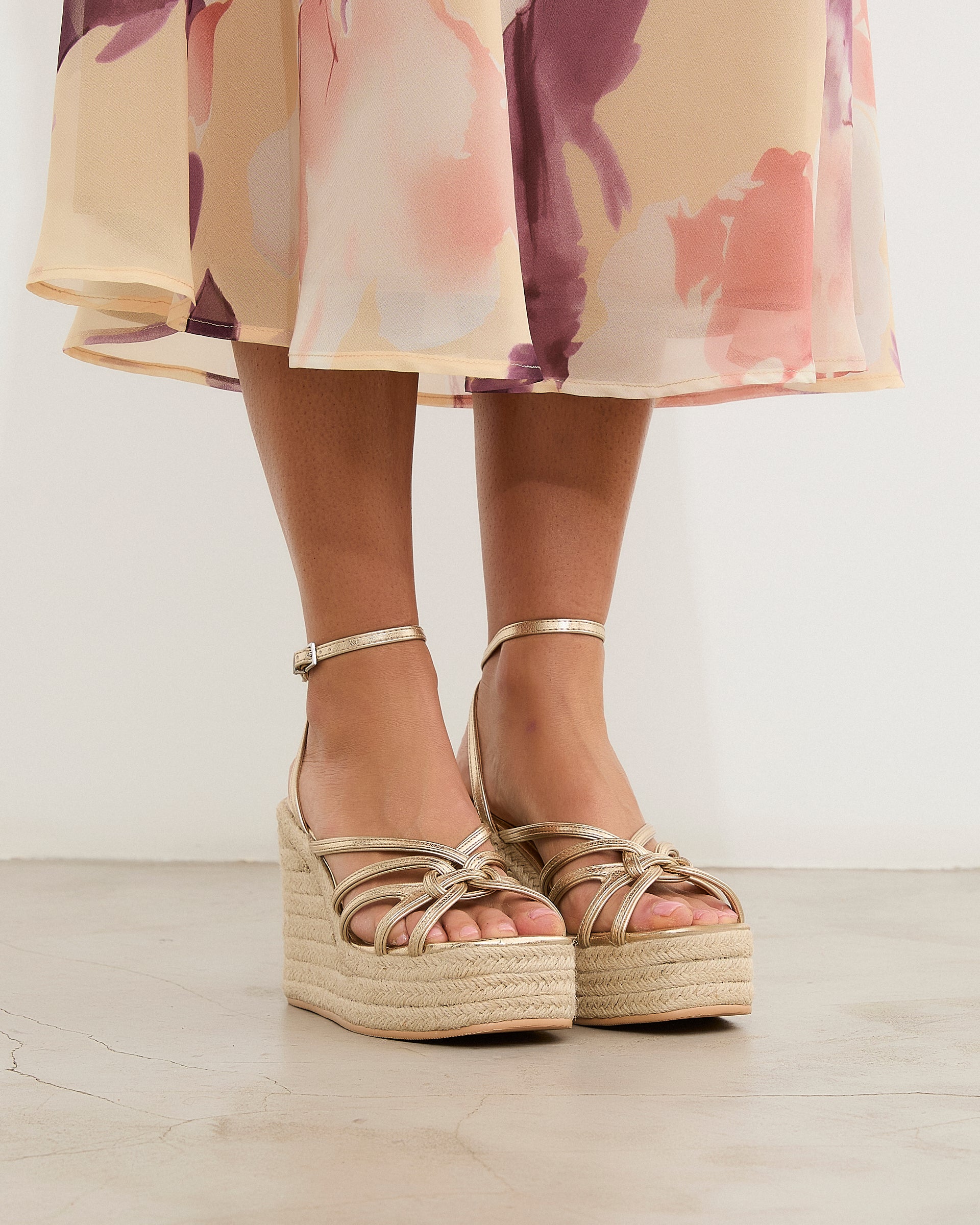 Sandalia de plataforma de esparto con tacón en color dorado brillante. Parte delantera con tiras y cierre al tobillo con hebilla metálica.