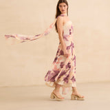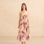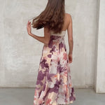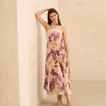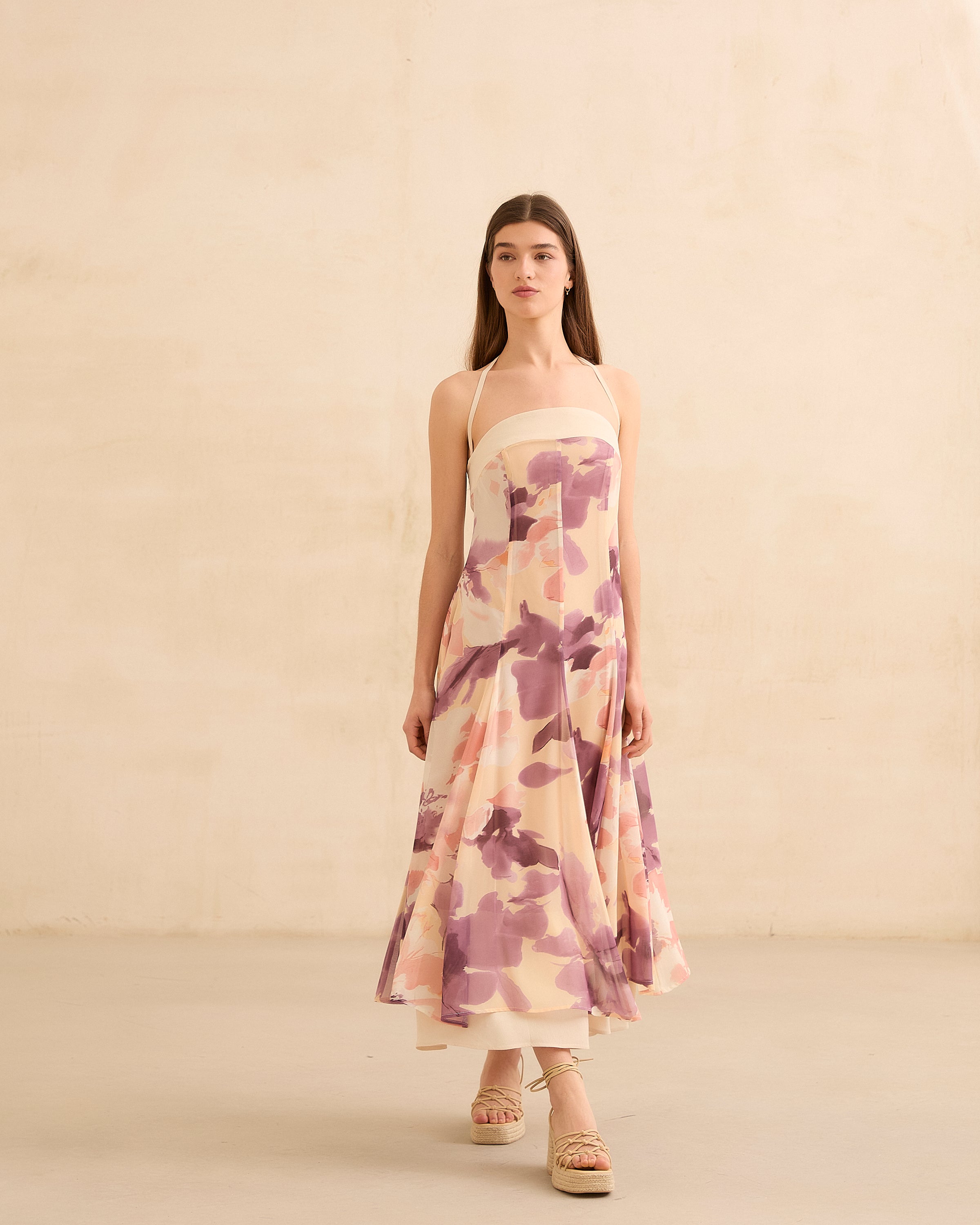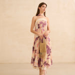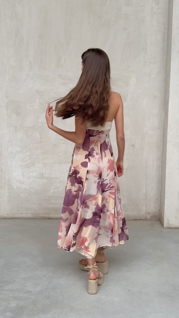 Vestido con corte palabra de honor con opción de tirante fino para ajuste en cuello. Ajuste en cintura y falda con vuelo. Cremallera lateral invisible y ajuste elástico en espalda. Print de motivos florales en tonos amarillos y lilas. Forro interior combinado a contraste.