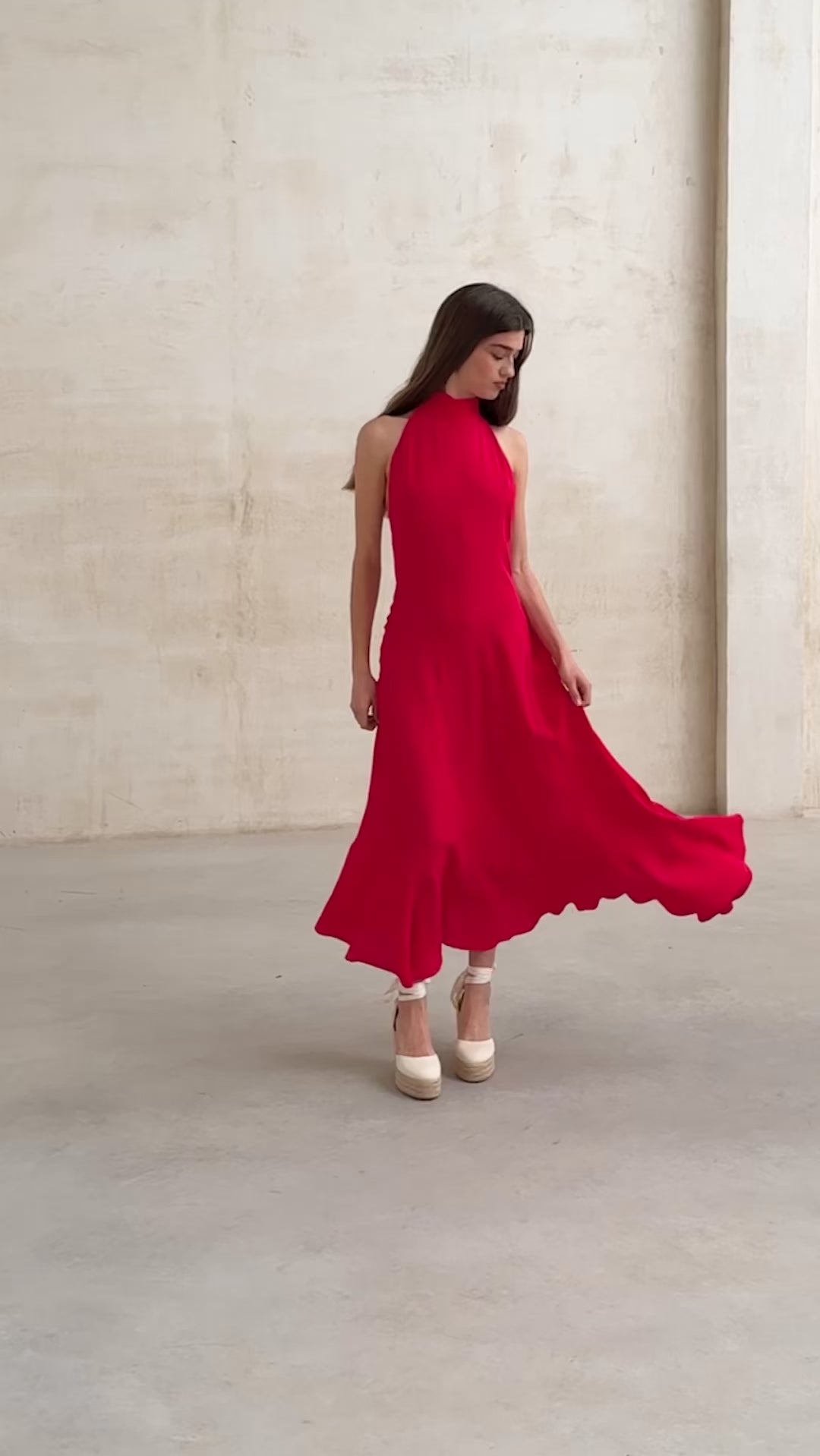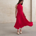 Vestido corte halter con espalda abierta en color rojo. Ajuste en cintura y falda con vuelo. Cortes transversales y bajo asimétrico.