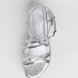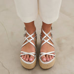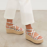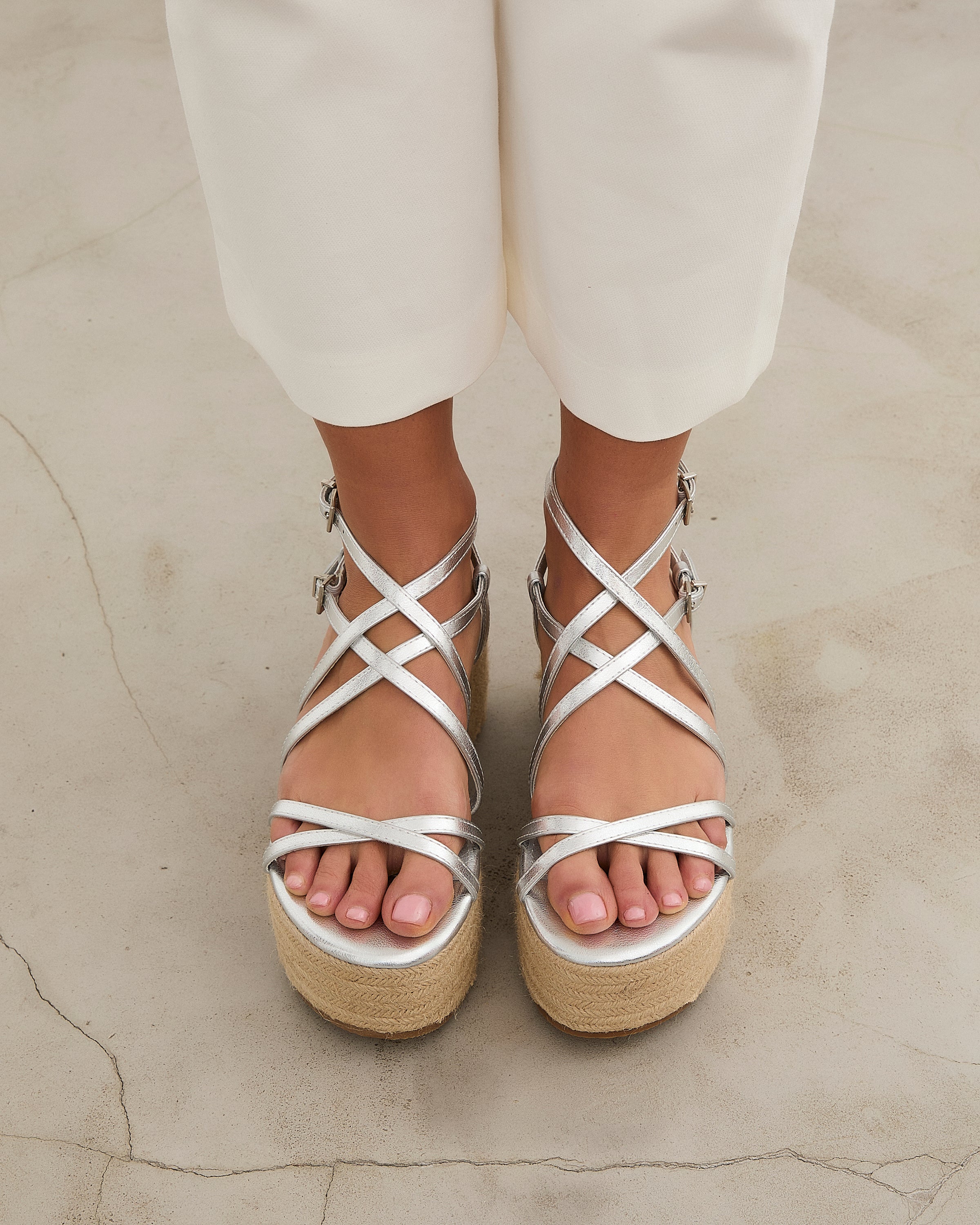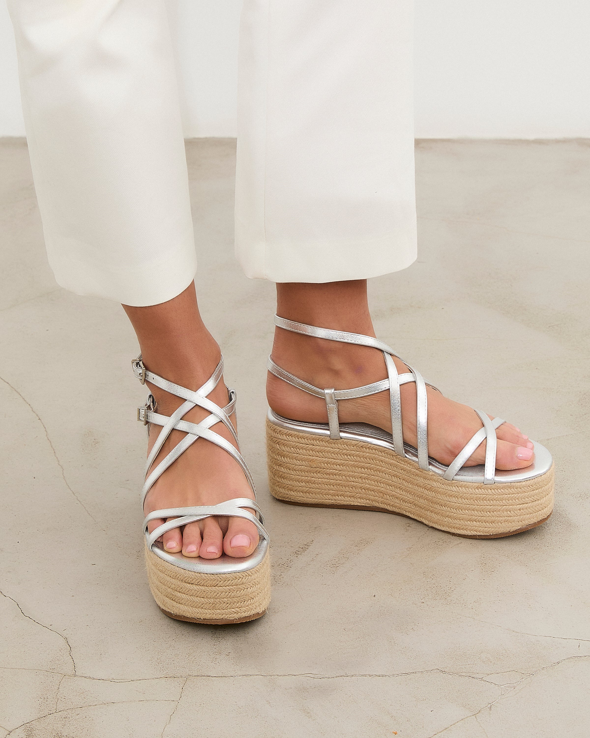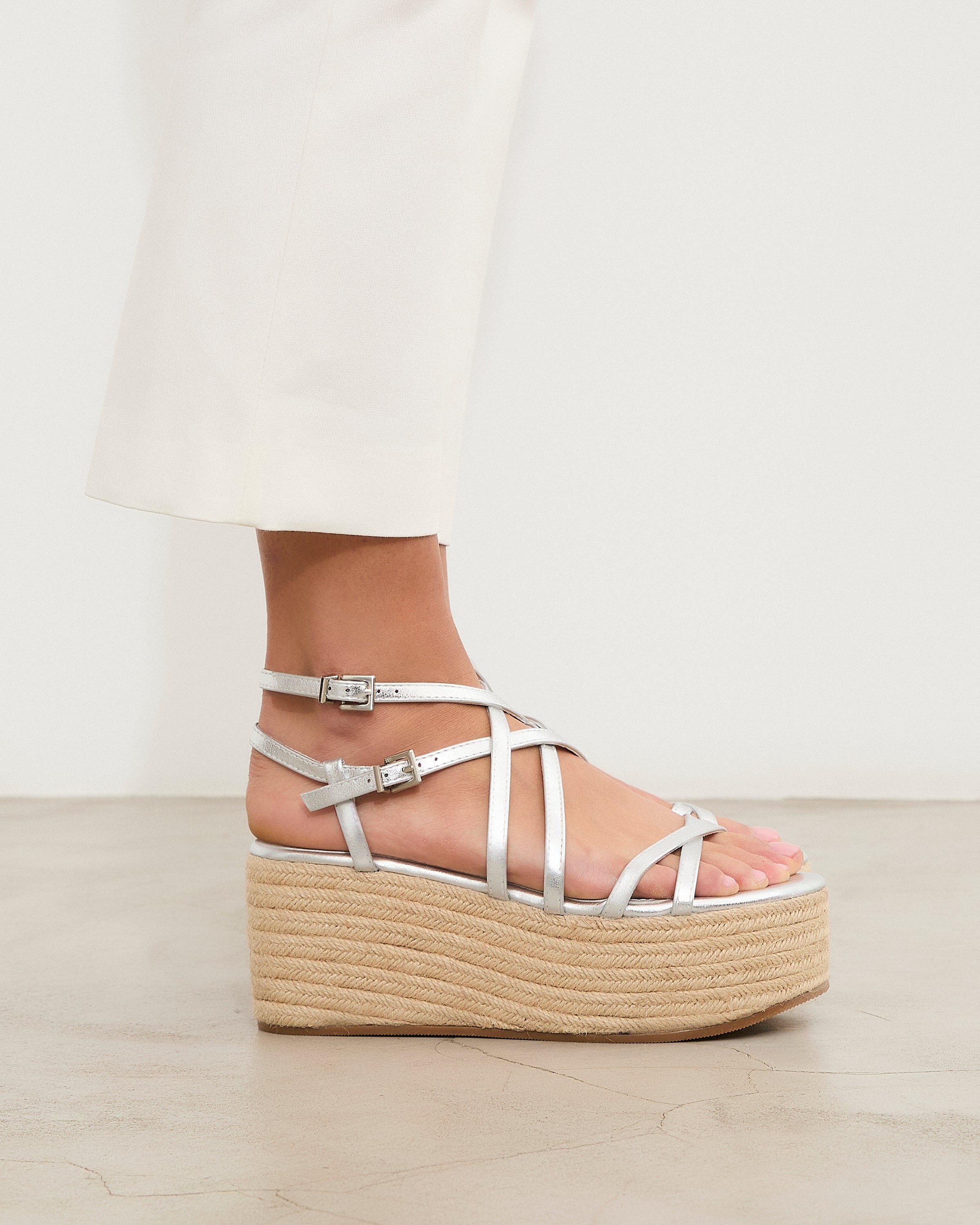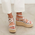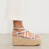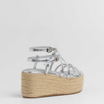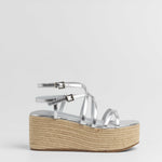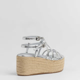 Sandalia con plataforma de esparto color plata con tiras a diferentes niveles y con doble hebilla para atar alrededor del tobillo.